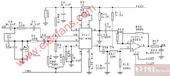 用MC1496构成的乘积型相位鉴频器电路如图所示。