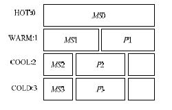 MDN 系统存储策略如图2 所示,所有影片分为4 个等级。0:表示最热门影片(HOT);1:表示较热门影片(WARM);2:表示较冷门的影片(COOL);3:表示冷门影片(COLD)。图中MS0, MS1, MS2, MS3 表示每一等级的影片存储在MS 上的百分比,P1, P2, P3 表示每一等级影片剩余部分存储在PN 上的百分比,可看出,热门影片全部由MS 存储。假定系统中共有N 部影片(所有影片大小相同为T),其中HOT, WARM,COOL, COLD 分别有N0, N1, N2, N3 部,由此可得出系统中MS 及PN 的存储空间MSstorage, PNstorage 如下:
