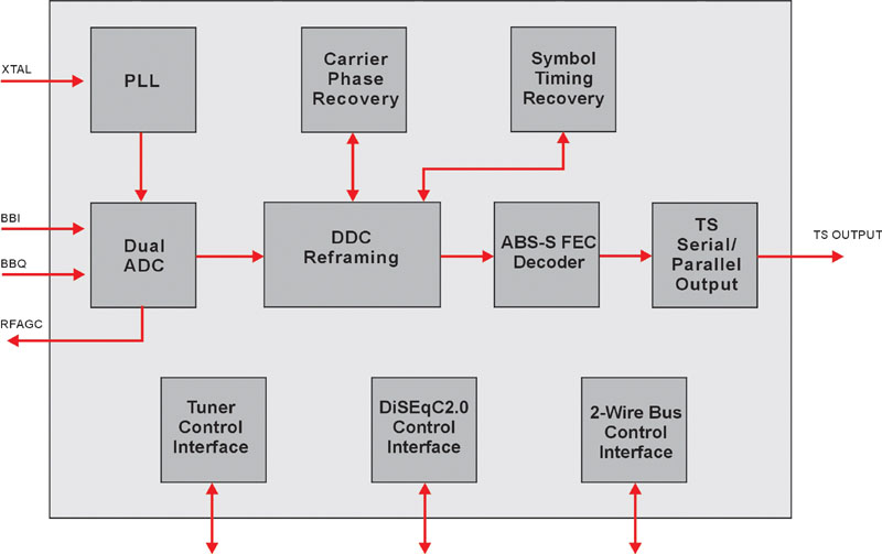 * AVL1108主要功能包括基带信号解调和信道解码,用于将卫星调谐器输出的ABS-S基带信号转换成TS流,并通过简单的接口提供给后端解码芯片。