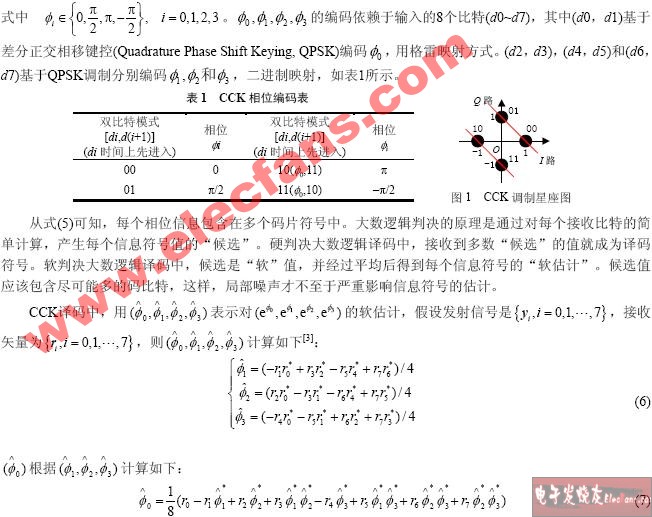 CCK是一种已编码调制技术,它把扩频、信道编码和调制作为一个整体进行设计,从而提高系统的整体性能。CCK码由256个8码片的码字集合所定义。码字组成为如下方程[2]: