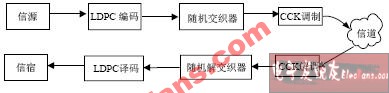 系统中采用(504,3,6)的规则LDPC码,交织深度为两个编码块,采用随机交织器。CCK解调采用大数逻辑软判决算法。信道分别是AWGN和Rayleigh衰落信道,其中衰落信道为3径,采用ITU的M.1225标准channel A多径信道模型,系统组成如图4所示。