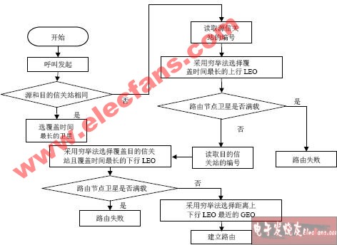 图中选路的流程是,首先从信关站出发,依据每颗卫星与信关站连接的剩余时间选择与信关站连接时间最长的LEO卫星。分别确定接入源和目的信关站的2颗LEO卫星后,再选择GEO卫星。由于只有两颗GEO卫星,以这两颗卫星到达已选定LEO卫星的路径长短为标准,选择路径最短的做中间转发。路由确定后,建立链路。源和目的信关站相同时,信关站对数据进行交换和处理。当纬度较高,信关站上空暂时没有卫星覆盖时,或者发生了拥塞,信关站上空的卫星信道全被占满,卫星没有新的资源可供利用时,都会出现路由失败。
