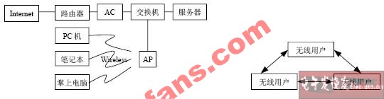 WLAN由无线网卡、接入控制器设备(Access Controller,AC)、无线接入点(Access Point,AP)、计算机和有关设备组成。下面以最广泛使用的无线网卡为例说明WLAN的工作原理。