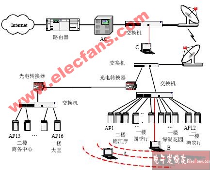 针对所出现的问题,本文选择四川成都锦江宾馆作为测试点,其WLAN是基于AP的网络结构,很具有代表性。锦江宾馆WLAN覆盖范围包括宾馆大堂、卢浮花园、锦江厅A厅、B厅、四季厅、商务中心等主要场所。网络拓扑结构如图3所示,WLAN用户终端通过无线网卡连接到AP,AP通过双绞线连接到交换机,使用微波设备接入位于移动机房的AC,进而连接到Internet。