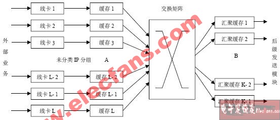 采用动态缓存的做法需要为每个汇聚缓存打上一个动态的标记,用以表明每个缓存当前的状态是空或是有某种类型的突发包正在该缓存中组装。当有一个IP分组到达时,交换矩阵轮询当前各汇聚缓存的状态,若发现某个缓存中待组装的突发队列与当前IP分组类型一致时,就将分组送到该队列中;若没有发现相匹配的突发队列,则将该IP分组送入一个空闲缓存中,启动一个新的突发包组装队列,同时将该缓存打上相应的标记。由于交换矩阵前面的缓存与后面的突发汇聚缓存不是一一对应的关系,各时刻同一汇聚缓存中突发包的类型也不确定,所以就加大了交换矩阵和后级发送模块轮询算法的复杂性。
