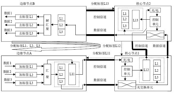 图4中,L1,L2和L3是通过GMPLS信令协议建立分组LSP时由边缘节点B分配给边缘节点A的分组交换标签,它们分别隐含以下LSP,即(L1,L11,L12,L13),(L2,L11,L12,L13)和(L3,L11,L12,L13)。为了简便,此处用标签代表所有LSP信息。L11是由核心节点1分配给边缘节点A的波长交换标签,隐含一条波长LSP(L11,L12,L13);L12是核心节点2分配给核心节点1的标签,L13是边缘节点B分配给核心节点2的标签。在边缘节点A,当IP包(数据1、数据2、数据3)来到后,对它们分别加分组标签L1,L2,L3,而边缘节点根据LSP信息发现它们都是到同一目的边缘节点B去的,再由光层的LSP信息把它们汇聚起来,按照突发汇聚的规则[5],在达到最大长度或最大时间后,往突发包的BHP里加上标签L11送往核心节点1,等待偏移时间后,L1,L2,L3则与数据一起传送到核心节点1。图4中的标签汇聚是为了直观而画在一起的,而一般的LSP汇聚都采用标签栈。但是在光突发中,光层的控制信息与数据是分开传送的,就没有必要再用标签栈,只需把原来的栈顶标签送到BHP即可。核心节点1根据标签转发表与收到的BHP中的标签,知道该把数据送往核心节点2,则接通相应的光开关,同时把BHP中的标签换成L12送往核心节点2,随后来的数据也直接送往核心节点2。核心节点2的数据处理与核心节点1类似。当数据到达边缘节点B时,B判断出它是光层LSP的终端,则解开收到的突发包,再根据IP层的分组交换标签分配表确定数据的去向并送出。
