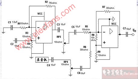 话筒放大器属于小信号低噪声放大器,常用分立元件电路,为了减小噪声,一般工作点选取较低,设计方法与一般放大器相同。也可采用低噪声运算放大器,可采用具有很高的输入阻抗的同相放大器形式,电路如图: