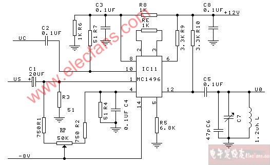 mc1496模拟乘法器构成的调幅器电路图