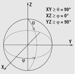 除了该辐射模式变化图以外,将辐射模式与天线的配置相联系也是很重要的。辐射模式通常在三个互成直角的平面XY、XZ和YZ上测试。虽然可以进行全3D图形测量,但由于这是一项耗时的工作且需要昂贵的设备,因此一般不这么做。定义这三个平面的另一种方法是使用一个球形坐标系统。这三个平面将由θ=90°,Φ=0°和Φ=90°来定义。图3显示了如何将球形符号与这三个平面联系在一起。如果没有给出有关如何将辐射模式图上的辐射方向与天线的配置联系起来的信息,那么0°为X方向,XY平面上角度朝Y方向趋增。就XZ平面而言,0°位于Z方向,同时角度朝X方向趋增。对YZ平面来说,0°位于Z方向,角度朝Y方向趋增。