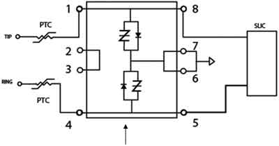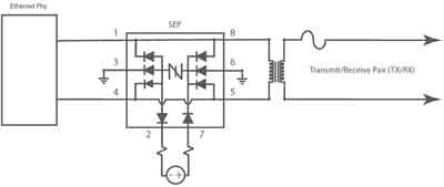跟楼宇内以太网不同,楼宇间以太网由于暴露在户外环境,所以具有高浪涌能量100A(10/1000)浪涌功能保护。对于用于实现超高浪涌能力的芯片保护阵列技术来说,这是不可行的。SEP(SIDACtor以太网保护)是一款新发明的器件,用于实现高浪涌和快速以太网线路保护。它为以太网线路提供了平衡保护,并且通过将偏置引脚(引脚7)连接到系统电源上来提供恒定电容。由于电容稳定,所以可以保持以太网信号的信号完整性。