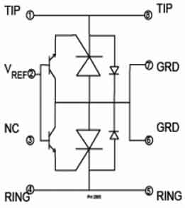 正浪涌被反并联二极管转移到地面上;Battrax保护器的栅极(Vref)引脚被连接到SLIC Vbat引脚上,这样它就可以跟踪SLIC电池电压的变化。