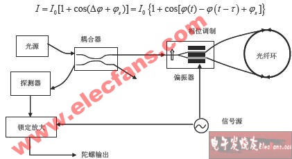 使用低损耗单模光纤形成环状,其总长L可达几百米甚至上千米,可大幅度地提高环形干涉仪的灵敏度,即使是微小的转动也能够产生可探测的相位差。因为光纤环内的单模光纤处于双光束干涉状态,其输出光强可表示为