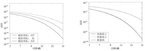 图5 不同相位码长的误码率与信噪比的关系曲线 图6 单双极码的误码率与与信噪比的关系曲线