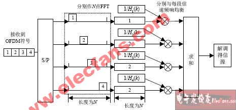 将一个时变的OFDM符号分为多个子符号段,每一小段里的信道参数不变或变化量很小。具体操作如下:设OFDM的子载波数为N,将正确同步的OFDM时域符号在删除保护间隔以后,切取长度为N点的OFDM符号,并分为m段,每段长度为N/m。将每一小段按原来在OFDM时域符号的位置前后补零,得到长度为N的OFDM符号,再作N点FFT变换到频域;用估计出的对应于该段数据的信道频域参数分别对其均衡,将均衡后的结果相加求和,再进行判决,解调得到信源信号,其操作过程如图1所示,图中是将OFDM符号分为四段均衡,将接收到的一个OFDM符号经过串并转换分成均匀的4段,按分段数据在原来OFDM符号中的位置前后补零到符号长度为N,然后分别经过FFT变换得到长度为N的频域数据;同时,将时域信道参数也分为四段,分别进行FFT得到分段频域信道参数H1、H2、H3、H4,然后用分段后的频域数据与分段后的频域信道参数分别进行相除均衡,将均衡后的结果进行合并,再送到调制解调器进行解调。通过分段,减小了信道时变对载波间干扰的影响。