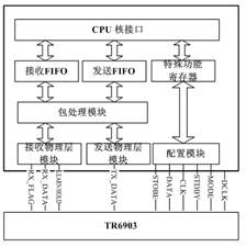 包处理模块:用硬件实现数据链路层部分功能。发送模式下,添加可变字节的前导码,3位的界定符,1个字节的帧长,可选的前向纠错编码,2个字节CRC16校验这些数据作为MAC层负载;接收模式下,包处理模块完成对数据包的解包,主要工作为前导码的检测,界定符的检测,可选的1个字节地址比较,2个字节的CRC16校验。