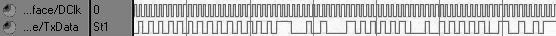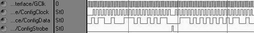 配置TR6903模式下仿真波形如所图 4示,以串行方式向TR6903写入6个字节的配置,改变TR6903工作频率,实现跳频。此时在ConfigClock的上升沿时从ConfigData送出10110010,00111010,01010110,00111010,10101010,10110010数据。Strobe为高时,ConfigClock停止。发送物理层帧部分仿真波形如图 5所示,以串行方式向TR6903发送物理层的帧。此时,先送出32位的0101…0101同步码,3个位的界字符111(TR6903检测到3个时钟周期以上的高电平),后面紧接是帧长及物理层负载。接收物理层帧部分仿真波形如图 6所示。TR6903在界定符发送完毕的最后一位,送出1个时钟周期高电平RxFlag信号;基带处理模块检测有效高电平,作为有效数据帧的开始,同时基带处理模块从LH引脚输出高电平,来响应TR6903。