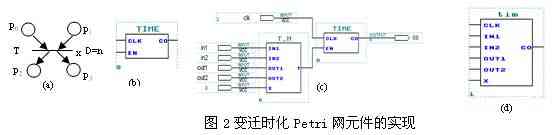 在图2(a)中变迁T与时延D=n相连,当库所P0和P1中各有一个托肯时,变迁T获得发生权,但到T发生,需有n个单位的延时.调用元件T_M和计时元件TIME,建立逻辑电路如图2(c)示,并经过编译形成图2(d)所示逻辑模块时化变迁元件tim。