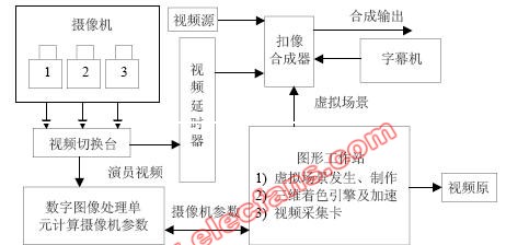 一个典型的虚拟演播室系统组成如图1所示。在虚拟演播室系统中,实时析取摄像机参数是关键。目前用于获取摄像机参数的方法有3种,即:精密机械/光学传感装置,红外/超声定位装置,模式识别及特征匹配方法计算摄像机参数。由于前两种方法存在需安装调试、使用复杂、可靠性差、改装摄像机和硬件成本较高等问题,使得虚拟演播室至今难以推广。后一种方法能够克服上述问题,是虚拟演播室技术发展的必然趋势。