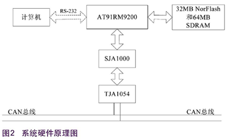测试仪的硬件设计主要包括三部分:处理器及其存储器电路、CAN总线接口电路、RS232接口电路。结构图如图2所示: