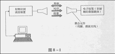 其中,电子标签又称为射频标签、应答器、数据载体;阅读器又称为读出装置,扫描器、通讯器、读写器(取决于电子标签是否可以无线改写数据)。电子标签与阅读器之间通过耦合元件实现射频信号的空间(无接触)耦合、在耦合通道内,根据时序关系,实现能量的传递、数据的交换。