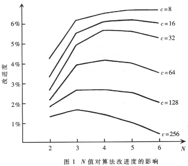 Dmm算法的第三步是将任务序列分为N段,重点在于如何选择最优的N值。一方面,N值越大负载越趋于均衡;另一方面,N值过大会使Min-Min算法降低效率。图1中的曲线表明,在选取不同的N值时,采用Dmmavg子策略的Dmm算法相对Min-Min算法的改进度。如图1所示。当c=m/n的值较小时,也就是平均分配到每台机器上的任务数量较少时,Dmm算法就表现出良好的性能。无论c取值多大,图l中的曲线总是在_N值为4或5时达到最高的算法改进度。因此,将N的值定为4,在任务序列划分时通常都分为4段。
