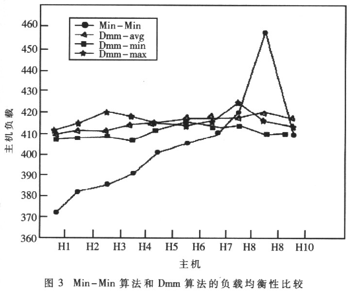 图3给出了四种算法的负载均衡性比较。其中,Min-Min算法中每个处理机的负载极不平衡,主要原因在于Min-Min算法将执行时问最短的任务分配在负载最小的机器上,这导致执行时间长的任务分配到负载较大的机器上。Dram算法的负载均衡性均高于Min-Min算法。其中,Dmm-avg的曲线最平滑,说明该算法的负载均衡性最高。