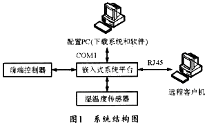 本系统由嵌入式平台服务器、前端控制器、前端传感器、客户端和配置PC组成。开发时可通过配置PC来下载系统和应用软件。嵌入式系统平台能够收集现场数据。并传送到远端客户机,之后由远端客户机对数据进行处理,接着发送控制信号给系统服务器,以便通过前端控制器对设备进行远程控制。其系统结构如图1所示