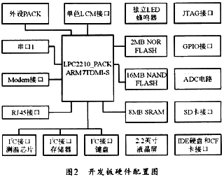 该系统的硬件开发平台可选择SmartARM2200。该嵌入式设备的核心是ARM7TDMI的LPC2210.开发板自身具有A/D转换器和多个GPIO(通用I/O)口,可对工业现场的各种设备、仪表进行数据采集和监控。使用时,只要将相应的传感器信号接入控制器的端口即可。其开发板系统的硬件配置如图2所示。