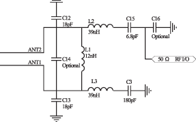 在所设计的系统中,读写器中的射频模块与有源标签中的射频模块电路类似,只是为了更有效地传输射频信号,采用单端连接的50Ω阻抗天线,需要在芯片天线连接引脚和天线之间加一个匹配网络,如图5所示。