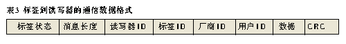 目前生产RFID产品的很多公司都采用自己的协议标准,国际上还没有统一的标准。就发展趋势来看,对于超高频(UHF)RFID系统,ISO/IEC 18000-7(针对433MHz有源RFID系统)和EPCglobal Class1 Gen2(针对860MHz~960MHz无源RFID系统)协议标准,有望成为统一的国际标准。本文所设计的RFID系统通信协议依据ISO/IEC 18000-7协议标准。读写器到标签的通信数据格式参见表2,其中用户ID、标签ID和参数为可选项,由命令类型决定是否选用。标签到读写器广播式响应的通信数据格式参见表3。