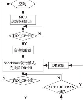 nRF9E5采用Nordic公司的ShockBurst技术(自动处理前缀、地址和CRC),实现低速数据输入,高速数据输出,从而降低了系统的平均功耗。在ShockBurst接收模式下,当收到一个有效地址的射频数据包时,地址匹配寄存器(AM)和数据就绪寄存器(DR)通知片内MCU把数据读出。在ShockBurst发送模式下,nRF905自动给要发送的数据加上前缀和CRC校验码。当数据发送完后,数据就绪寄存器(DR)会通知MCU数据已经处理完毕。当系统没有发送和接收任务时,将进入空闲方式。ShockBurst技术降低了MCU存储器需求,同时也缩短了软件开发时间。