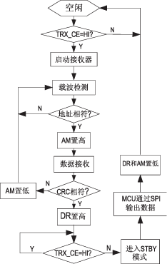 无线数据发送和接收的流程分别如图6和图7所示。图中TRX_CE为发送和接收使能寄存器位,DR为数据就绪寄存器位,AM为地址匹配寄存器位,AUTO_RETRAN为自动重发寄存器位。ShockBurst工作模式在前文已有介绍。