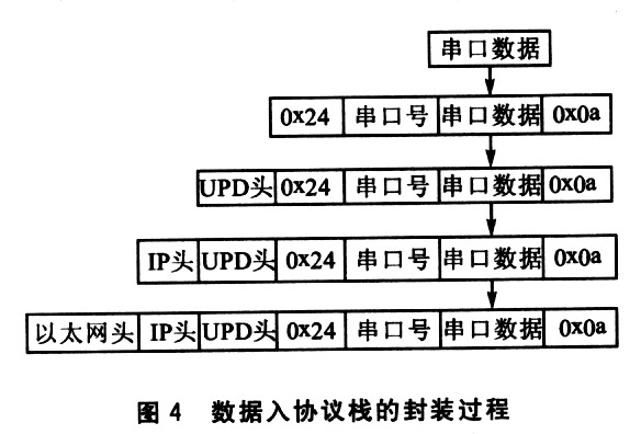 多串口转换网关,实现多个串口和一个网口间的数据转换,关键是多个串口数据如何送到网络上、网络数据又怎样转到多个串口。其中,串口链路层完成串口数据收发功能,串口网络层作为TCP/IP应用层的一部分,实现串口帧的封装。发送是入协议栈的过程,如图4所示,接收是出协议栈的过程(图略),不同之处在于对数据的收/发处理。