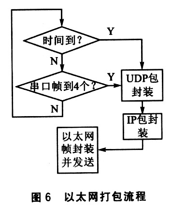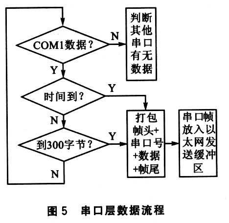 为了能一次传输尽量多的数据,系统对数据长度作了严格定义:串口数据帧的数据段最大长度为300个字节;网口发送帧的数据段最多允许4个串口数据帧。同时,还要满足具体应用对实时性的要求:对每一个串口规定一个最长响应时间。时间到时,不管是否已接收:300个字节都要对串口数据进行封装,并放人以太网发送缓冲区;同时,为了避免系统由于等待以太网发送缓冲区串口帧数达到4,而造成串口数据不能实时发送,要求在一定的时间内进行一次以太网通信,而不必等待4个串口帧到齐才打包传输。
