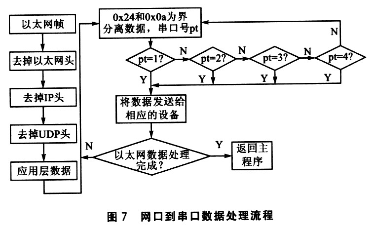 网口数据到多串口的数据流向,是对以太网链路层的数据帧向上逐层解包的过程。如图7所示,将收到的以太网帧,依次去掉每层的协议头分解出应用层数据,再以0x24和OxOa为分界分离,根据串口号字段的值,将信息发送到相应的设备,完成预定的控制。