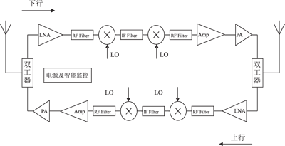 目前成熟的采用模拟方式处理的直放站框图如图1所示(以宽带直放站为例),其中,下行链路是直放站通过天线接收基站发来的信号,经过低噪声放大器(LNA)、射频滤波器(RF Filter)、混频器(下变频)、中频声表滤波器(IF Filter)、混频器(上变频)、射频滤波器(RF Filter)、功率放大器驱动模块(Amp)和功率放大器(PA),再通过天线发射出去;上行链路是直放站通过天线接收移动台(通常是手机或车载电话),经过与下行链路类似的处理后,通过天线发射给基站。