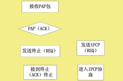 系统主流程图如图4所示,GPRS模块在完成系统初始化以后,主动和SERVER进行首次的资料交换。GPRS模块用PPP的方式接入到Internet,因此先要完成PPP连接。PPP连接包括:LCP协商、PAP协商、IPCP协商,由于篇幅限制本文仅列出PAP协商流程图即如图4所示。