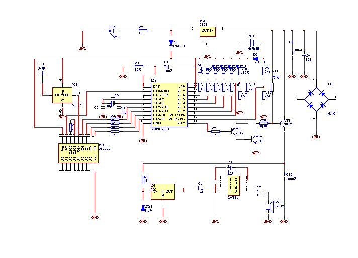 电路原理图如下图所示,主要由无线接收、数据解码、数据处理、报警电路、输出显示、断电报警和电源电路组成。整机接收频率315M,数据解码采用市面上用得较多的PT2272专用解码芯片,可靠性及稳定性较好;数据处理的任务由单片机完成,用于区分报警信号,同时接受各种操作指令,完成相应的操作,当接收到报警信号后一方面驱动报警电路,发出响亮的警车报警声,另一方面输出具体的地址信息,确定是哪一路发送了报警信号;断电报警功能则实时监控电源状况,当市电断电后,能发出嘟嘟的报警声,提配使用者注意,外供电已被切断,若为不法分子破坏所致,可提早进行防范。