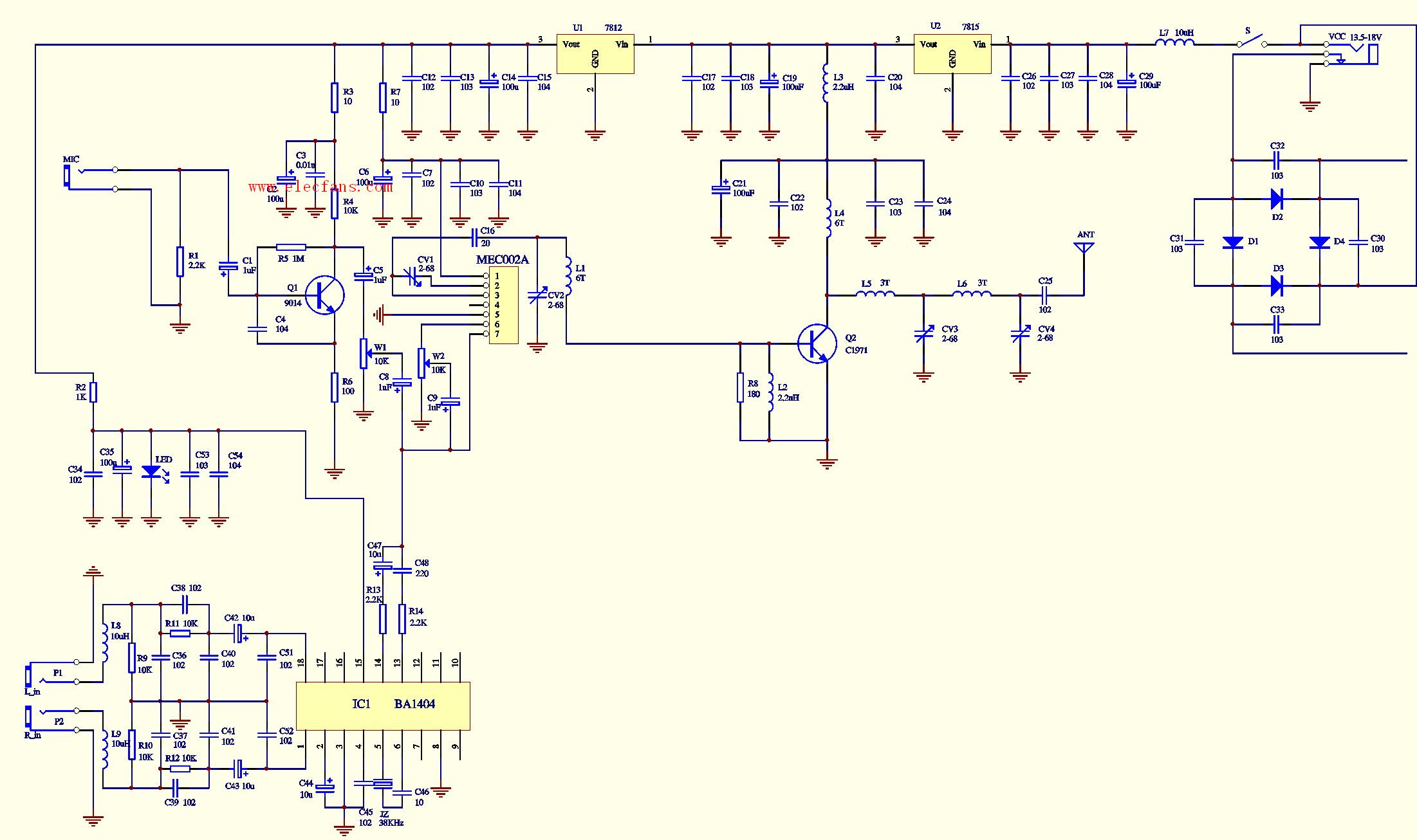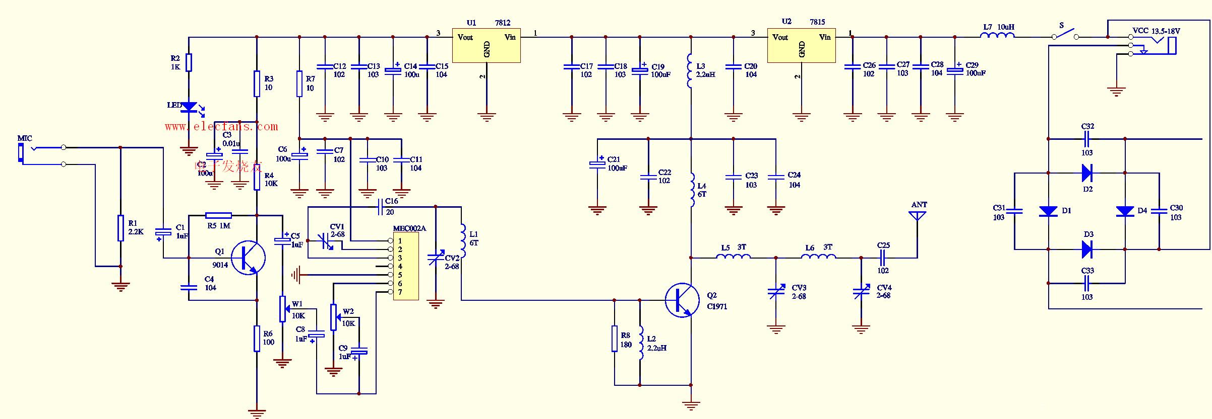 图1是由MEC002A构成的三公里单声道调频发射电路,可以看出,其射频电路实际上只有两级,一级是由MEC002A及周边相关频率控制器件构成的射频振荡输出电路,另一级是由C1971及相关元件组成的丙类射频功率放大器,其它的元件主要是供电和滤波及麦克风放大之用。虽然MEC002A内含麦克风放大电路,但对一些单位而言,需要另外外插麦克风而不使用模块内的高灵敏度麦克风放大电路,为了得到稳定的工作频率,本电路设置了多级电源稳压和滤波电路,其中U1(7812)为MEC002A模块提供稳定的12V电压,C12-C15为电源滤波电容,使工作电压更稳定,以保证MEC002A模块不会因工作电压的改变而产生频率漂移。R3,R7及L3为级间退耦器件,可以有效地克服各级之间因使用同一电源而带来的相互干扰。Q1及其周边器件构成麦克风放大电路,音频输出经C5耦合至W1以控制麦克风的音量大小,受控的麦克风音量经C8耦合至MEC002A的调制端(第7脚),对MEC002A内部高频振荡电路进行调频。MEC002A的第6脚为其内部麦克风音频放大输出脚,经W2控制其声音感应灵敏度后由C9耦合至7脚也对MEC002A内部高频振荡电路进行调频,如欲使MEC002A的内部麦克风不工作,只需将其4脚悬空即可,当需要启动内部麦克风电路时,将4脚接地即可实现。CV1为MEC002A的射频输出频率控制电容,通过改变该电容容量,可使MEC002A的输出频在68-118MHz范围内变动。基本覆盖了整个校园广播和调频广播频段。但是输出频率的一旦变动,后面一级的射频功率放大器也要跟着调节,才能使射频输出功率最大,发射距离最远。因而建议购买时最好指定所需的工作频率,以便厂家将后级功放电路在所订频点的增益调到最大。MEC002A的第3脚为其射频输出脚,经调制后的调频波由该脚输出经C16,CV2,L1组成的选频网络后送至由Q2(C1971)构成的丙类放大器的基极,MEC002A的1脚为电源供应端,5脚为电源地。Q2工作在丙类状态,偏置电阻为其基极提供负偏压,可使该电路的输出效率比甲类更高些,其前提条件是前级必需要有足够的激励功率,对12V工作电压下的MEC002A来说,其输出功率已近200mW,完全可以推动该丙类放大电路。U1为C1971提供稳定的15V工作电压,L5,L6,CV3,CV4构成选频网络,通过调节CV3,CV4可使Q2的输出功率有效地传送给发射天线,整机在18V工作电压下工作电流约为800mA,射频输出功率约3W。本电路还提供了市电供电功能,D1-D4组成全桥整流电路,C30-C33为滤波电容,可减少市电带来的交流纹波。输入交流电压控制在18V左右。整机工作直流电压为18V,当使用13.5-18V电压时U2可免去不用,直接用跳线短接其1,3脚焊盘。