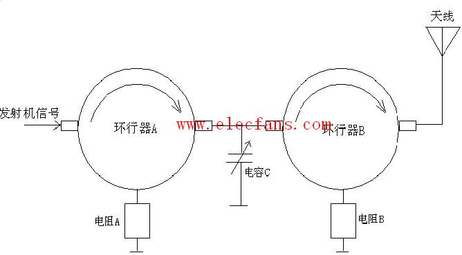 在这里我向大家介绍一款利用环行器的单向传输特性做成的无源无级功率调节器。在高频功率放大电路中,普遍都是利用PIN二极管的电抗特性来完成输出功率的调整,这种功率调整电路有其不足之处,当功放管偏置调定以后,一般都有某个最佳的激励电平与之对应,使其输出达到最佳状态,激励过小,影响信噪比;激励过大则会造成非线性失真。采用环行器所做成的无源功率调节器将不存在此问题,它由两个环行器串接而成,并在其串接线与地之间加入一个可调电容器,如图所示。这个无源功率调节器加插于发射机与发射天线之间,单环行器A起着输出功率调节的作用,环行器B起着隔离保护的作用,调节电容C,使电路发生失配,输出功率的一部分将变成反射功率被电阻A所吸收,C的容量大小,影响着反射的大小,所以通过调节电容C就达到了控制输出功率大小的目的。
