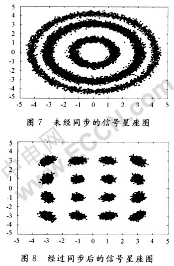 通过观察16QAM接收信号的星座图可以明显看出:同步与否对于信号的恢复起了决定性的作用,该同步系统方案可以在低性噪比的情况下正确地恢复出原始信号。