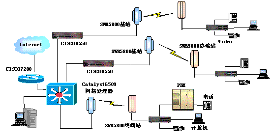 目前SWR5800宽带无线接入系统可提供的业务项目可分为两个部分:数据及语音。 数据部分 1、高速Internet数据接入,同时提供基于IP网络的各类数据业务; 2、VOD视频点播; 3、视频会议; 4、视频监控; 5、宽带VPN业务; 6、企业网内部连接、跨地区连接和WAN连接。 语音部分 IP语音电话。 根据宽带无线接入网络建设的规划和对系统功能的要求,并综合考虑规划建网城市的用户及潜在用户的分布、地势和楼宇布局等相关条件,SWR5800宽带无线接入系统的建设可单独实施,也可作为3.5GHz MMDS网的补充接入手段。通过在城市地区选定并设立5.8 GHz中心基站,采用8扇区方式全向覆盖5-10公里的区域,建立5.8GHz宽带无线接入网。为了与3.5GHz MMDS网络互为补充和备份,加强网络的覆盖,5.8GHz中心基站的选址可与3.5GHz同址。基站由一个或多个接入点(AP)组成,系统采用45°的天线,每个AP天线的半功率波束为45°×16°,在水平方向构成一个45°扇区。基站能够通过8个扇区覆盖360°半径范围内的多方用户,每扇区最多可接入253个远端站。同一个中心基站的多个AP采用不同的频率和极化方式对多个方向进行覆盖,以提高频谱利用率和增加中心基站的接入带宽。使用扇区天线的目的是为了提供广阔的覆盖范围和强大的传输能力。终端站用户可采用定向天线指向基站所使用的扇区天线,以确保从基站至终端站之间的数据传输。根据终端站至基站间的距离,终端站可选择不同增益的天线来增强信号强度。在基站之间,可利用5.8GHz设备进行连接,降低建设成本并提供高效率的基站(HE)之间数据通信。每个中心基站由一个控制服务器(CS)对整个中心基站进行管理,接入点间、控制服务器和宽带网之间通过以太网交换机连接。终端站和基站进行无线通信,并通过100/10Base-T以太网接口连接本地局域网。每个用户可以经由以太网交换机或路由器和其他用户共享带宽,以提高整个网络的使用效率。同时,在网络布署方面更加容易。网管系统可存储用户数据和系统配置,对整个系统进行故障诊断、告警、统计,通过IP协议和各个中心基站的控制服务器通信,系统管理者通过管理终端进行控制,维护和设置。 每个城市逐步建立10座基站:每一座基站采用45°的扇区天线,每一扇区提供4个远端站用户, 共8付天线,覆盖约5~10公里的范围。 每个城市逐步建立320终端站:每一基站有8个扇区,每一扇区发展4个用户。因此,每一基站 共有32个用户,10个HE共320用户。 在方案中,我们将采用SWR5800系列宽带无线接入设备在现场各楼顶做点对多点无线网络的 架设工作,系统安全可靠,经济效益比高。 设备使用OFDM正交频分多路复用技术,数据传输率可达54Mbps。 基站采用8个SWR5800 AP外接平板扇区天线与SWR5800 RU进行连接,能够实现360度无缝覆 盖,而且保证网络的带宽,并能提供IP语音、视频会议系统、多媒体数据传输、VPN虚拟 专网和VOD视频点播等多种增值服务业务。 在远端站使用定向天线情况下,最远传输距离可达20公里。 天线方向对准,并在每个点的天线馈线与室外单元之间加装一个同轴避雷器。 可采用以太网网线供电方式,便于安装架设,也有利于今后对设备的维护。