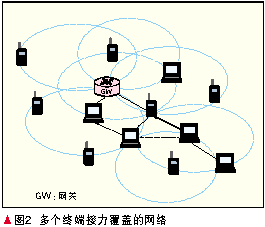 一种解决方案如图2所示。为了保持如图1的较小信号发射功率P1都能应用到所有终端,并使在覆盖边缘或远端的用户终端能接入WGW,采用通过具有路由功能的邻近终端作中继接力,经过多跳,接入到WGW,实现微小功率下的Internet接入。这种形成微小功率区域覆盖的解决方案的综合,构成Ad Hoc网络。这种网络可实现微小信号功率接入,同时接入最大用户数不会增加,但是用户终端间中继接力通信需要增加额外开销。这对具有路由功能的终端依赖较大,在终端移动情况下路由选择和网络拓扑不能固定,变动大。不过,Ad Hoc网络不需要增添另外的无线路由器来实现微小区覆盖,通过终端的中继接力接入Internet,对构建终端不太移动、位置分布比较随机的无线传感器网络非常方便、实用和有效。