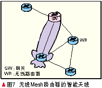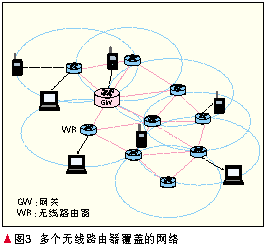 另外一种解决方案如图3所示。将一个WGW支持的相关区域内划分成不同的多个微小区域,可彼此重叠,各微小区设立一个无线路由器(WR),形成众多无线路由器的网络覆盖。每个用户终端就近接入相应的WR,WR或直接接到GW,或通过邻近WR中继接力接到GW,实现整个区域的Internet接入。如果每个WGW都是这样一种引入众多WR的区域覆盖,多个GW覆盖区域的综合,就构成一种新型无线网络:无线Mesh网络,如图4所示。图4中众多WR相互合作和协同,成网状分布,对整个城市或任意区域无线覆盖,实现无线移动通信。