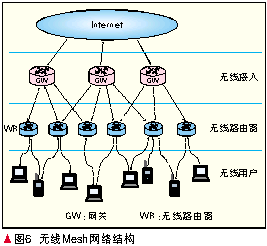 从图3可以看出,无线Mesh网络在通常的WGW(实现无线Internet接入)、无线用户终端的基础上,增添了无线路由器,由如图5所示的原有基础的无线接入网络结构演变成如图6所示的无线Mesh网络结构。无线Mesh网络增加了无线路由器层,各路由器间由无线连接,路由器与无线IP接入点(WGW)间由无线连接,并可交叉链接,形成密集网络。由此衍生出无线Mesh网络特有的基本技术和处理方法,它们都是与常规单纯的无线接入网络不同的新增无线路由器层直接相关联的。