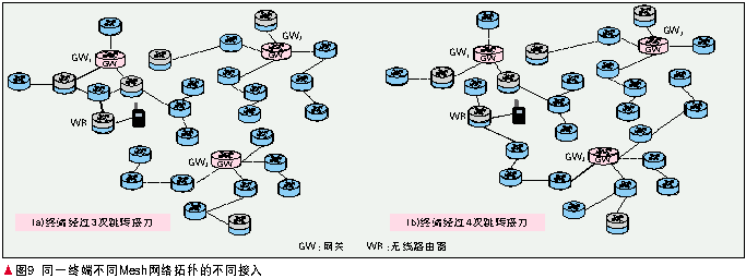 提供媒体访问控制(MAC)接入的多信道技术,同通常的无线通信网络一样,有频分多址(FDMA)技术、时分多址(TDMA)技术、码分多址(CDMA)技术和使用定向天线的空分多址(SDMA)技术,实用中经常是这些多址技术的部分或全部综合应用,形成彼此独立互不串扰的多信道接入技术。由于WR的定点定向传输可以充分利用智能天线技术实现空分多址,实现尽可能多的互不干扰独立传输信道。相对常规无线通信,这是无线Mesh网络的又一特色。在多址接入技术支持下,无线Mesh网络的MAC层设计与通常的典型无线网络的MAC设计一样,同接入点相关。由于无线Mesh网络不是单跳而是多跳系统,需要支持多跳的MAC设计。首先是就近Mesh路由器的接入选择。无线Mesh网络是自组织网络,网络路由连接和用户终端接入状况的拓扑结构随地理位置、通信环境、用户移动、WR布局等不同而不同,是变动的。如图9所示,图9(a)是一种Mesh拓扑结构,终端经过3次跳转接力,接入Internet接入点GW1,完成MAC过程。图9(b)是同一地区同样的Mesh路由器和WGW布局,但Mesh拓扑连接不同,该终端在同样位置,选择同样的Mesh路由器,要经过4次跳转接力,接入Internet接入点GW3,完成MAC过程。但如果选择临近的另外不同的Mesh路由器,可能只经过2跳或3跳,就能接入GW1。因此,无线Mesh网络的就近Mesh路由器的接入选择,是动态的,与通常设计不同。典型的有应用于IEEE 802.11的多信道MAC技术协议(MMAC协议),并考虑MAC层与网络层的交互,引入多信道协同子层(MCCL),以此增加网络能力。