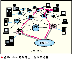 无线Mesh路由协议可参照Ad Hoc网络路由协议,目前几种典型的路由协议有:动态源路由协议(DSR)、目的序列距离矢量路由协议(DSDV)、临时按序路由算法(TORA)和Ad Hoc按需距离矢量路由协议(AODV)等。DSR是最常见的一种对等的基于拓扑的反应式自组织路由协议,它的特点是采用积极的缓存策略以及从源路由中提取拓扑信息,通过比对,实现路由创建。图10表示一个无线Mesh网络,可能有上下行不同的路由选择。无线Mesh网络中Mesh路由器通常都是静止不动的,原则上没有功耗限制,也没有用户移动带来的路由器位置改变和路由拓扑改变,因此,可将现有Ad Hoc路由协议加以简化,进行跨层设计,建立简单得多的路由协议。但是,对于移动用户终端需要采用完全类似Ad Hoc的路由协议,寻求就近接入点和接入路由。