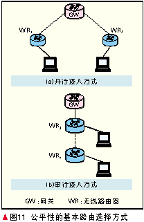 接入网络的路由协议的另一个问题是如何选择路由实现接入的公平性,让用户终端接入网络的机会、数据速率和通信质量是基本上一致的。图11给出了实现公平性的基本路由选择方式,在可能情况下,对各自Mesh路由器转接基本能力相同时,尽量选择如图11(a)的并行接入方式,WR各自支持接入的用户终端,以可能的最大数据速率支持连接到Internet,各用户享受的支持是相同的公平的。采用图11(b)的串行接入方式,在Mesh路由器基本相同能力情况下,要公平就不能实现最大速率。这时,WR4通过WR3把用户终端以数据速率S4接入WGW,如果WR3有用户接入,WR3能支持的速率就是S3-S4,如果WR最大支持能力为S,则可能实现的公平接入是:S3=S4=S/2,WR4没有达到最大支持能力,WR3达到最大支持能力,但它直接联络的用户只能实现WR3部分接入能力。只有在WR3接入能力明显大于WR4接入能力时,串行接入方式对实现接入公平,才比较有效。这种接入公平性的考虑,也是实现网络各Mesh路由器最大能力的接入考虑,可使网络容量最大。