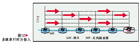 为实现最大网络能力,需要凭借在串行配置下的多跳链路(路由)。这种链路为提高效率,采用分时工作,因此要研究避免碰撞的分时策略和处理方法。如图12所示。