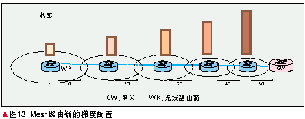 而在多跳末端位置的Mesh路由器由于转接工作少,可采用较低数据速率和较大区域覆盖,实现最优网络能力。如图13所示。